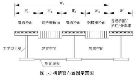该结构利用钢格栅与工字钢梁间隔布置,为了便于更换钢格栅,钢格栅与桥梁之间通过螺栓连接。在正常天气环境下机动车轮胎轧普通桥面行驶,保证了车辆行驶时的舒适度和环境噪声,在遇恶劣雨雪天气时,机动车自由转换到相邻水平平行的格栅车道上行驶,保证了车辆在恶劣天气条件下顺畅行驶的安全性,钢格栅桥面下方设置了积雪空间并连接排水系统。